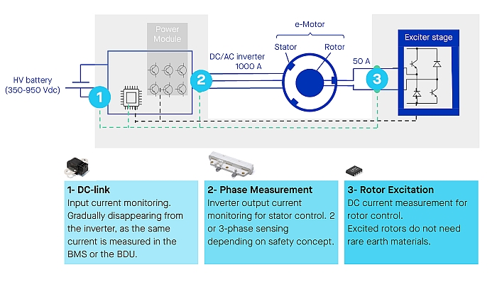 Dans la commande moteur, les capteurs de courant surveillent et mesurent le courant circulant dans le moteur qui propulse le véhicule, et permettent son fonctionnement. Ces capteurs interviennent à trois étapes importantes : le lien DC, la mesure des phases et l’excitation du rotor.