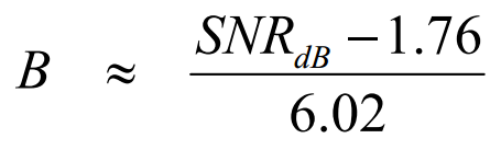 Cette équation montre comment le nombre de bits peut être obtenu à partir du rapport signal/bruit et constitue la base de calcul de l’ENOB. Dans le cas d’ADC idéaux, le résultat pour B sera toujours un entier réel positif. Dans le cas contraire, qui