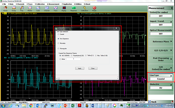 En sélectionnant le type de ligne « Non-Dispersif », et en effectuant à nouveau le mesure de la figure 2c, on obtient le résultat de la figure 2d. La trace active (orange) montre les résultats pour le type de ligne « Non Dispersif », avec la disparition de l’estompement du signal et le relevé de distance plus proche de la valeur attendue. Cette fonctionnalité offre aux utilisateurs davantage de flexibilité pour les mesures sur les guides d’ondes creux dotés de caractéristiques non dispersives. Cette solution se fonde sur une option proposée sur les VNA Shockline d’Anritsu, qui permet à l’utilisateur de configurer le milieu de mesure (ou le type de ligne). Voir figure 3.