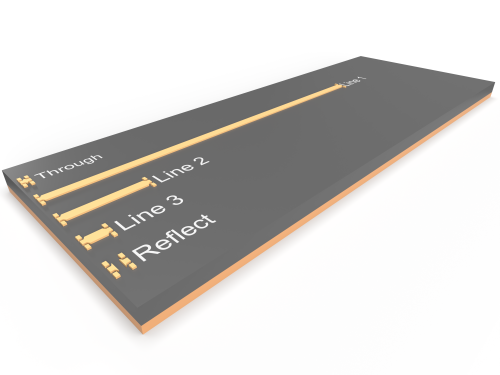 Généralement, un substrat de calibration sous pointes est défini par de multiples standards tels que Open, Short, Load / Match, Thru et Line. Les avantages de se reposer une solution de calibration industrielle résident dans la précision des différents standards précédemment mentionnés et leur disponibilité, qui va varier en fonction du type de calibration envisagé (SOLT, TRL, etc…). Une calibration TRL fait intervenir au minimum deux ports de mesure et repose sur 3 standards : Thru (T), Reflect (R), et Line (L). La figure 2 montre un exemple de substrat de calibration TRL, comprenant trois lignes (soit trois standards Line).