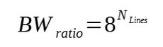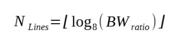 Dans un premier temps, exprimons le nombre d’éléments Line (nommé ) nécessaire pour une calibration TRL en fonction du ratio de bande passante nommé . Ici, il sera plus pratique d’associer la bande passante à un ratio, qui s’obtient simplement à l’aide de la formule suivante :