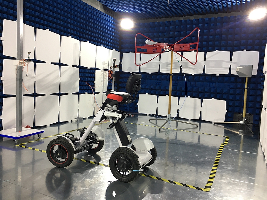 La première chambre d’essais CEM est adaptée à la réalisation d’essais d’une diversité d’appareils et d’équipements fixes. La seconde est quant à elle équipée d’un banc E-Bike permettant de s’assurer de la conformité CEM d’un vélo à assistance électrique selon la norme EN 15194. Elle est également adaptée à la réalisation des essais CEM sur une variété d’engins électriques mobiles pesant jusqu’à 4 000 kg tels que des transpalettes, des fauteuils roulants, des robots mobiles autonomes, des petites machines agricoles et forestières, etc.