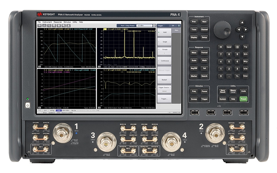 Les analyseurs de réseau de la famille PNA et PNA-X couvrent des bandes de fréquences démarrant à 900 Hz et allant, selon les modèles, de 8,5 GHz jusqu’à 120 GHz. Ces instruments, dotés de deux ou quatre ports, permettent via leur pilotage par leur écran tacticle la caractérisation de composant linéaires et non linéaires opérant dans le domaine des radiofréquences et des micro-ondes.