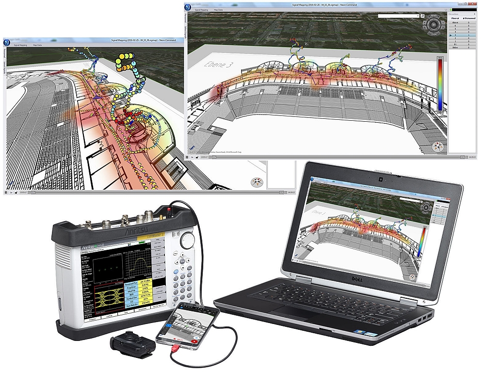 La plate-forme MA8100A d’Anritsu exploite la solution Tracking Unit NEON® de TRX Systems avec le logiciel NEON® Signal Mapper pour fournir en temps réel des informations de localisation 3D pour les applications de test et de mesure à l’intérieur d’un bâtiment. TRX Neon Signal Mapper peut être configuré avec tout instrument portable d’Anritsu qui dispose d’un analyseur de spectre, tels que les modèles le Spectrum Master ™, RMT Master ™, Site Master ™, BTS Master ™, Cell Master ™, et VNA Master™.