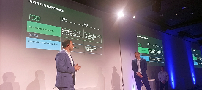 Reggie Rector et Allan Solomon sont montés sur scène pour rappeler les principales innovations de NI en matière de contrôle d’instruments par PC, de programmation graphique, d’instrumentation modulaire, de systèmes connectés… en mettant notamment l’accent sur les instruments au format PXI et les unités d’acquisition et de contrôle modulaire des gammes NI CompactDaq et CompactRIO. Ils ont insisté sur le fait que NI s’était constamment attaché à développer des solutions logicielles, à l’instar de LabView, visant à réduire la complexité de la programmation, à faciliter le travail collaboratif, à simplifier l’automatisation des tests, à favoriser leur intégration à l’écosystème, à améliorer la visualisation des données…