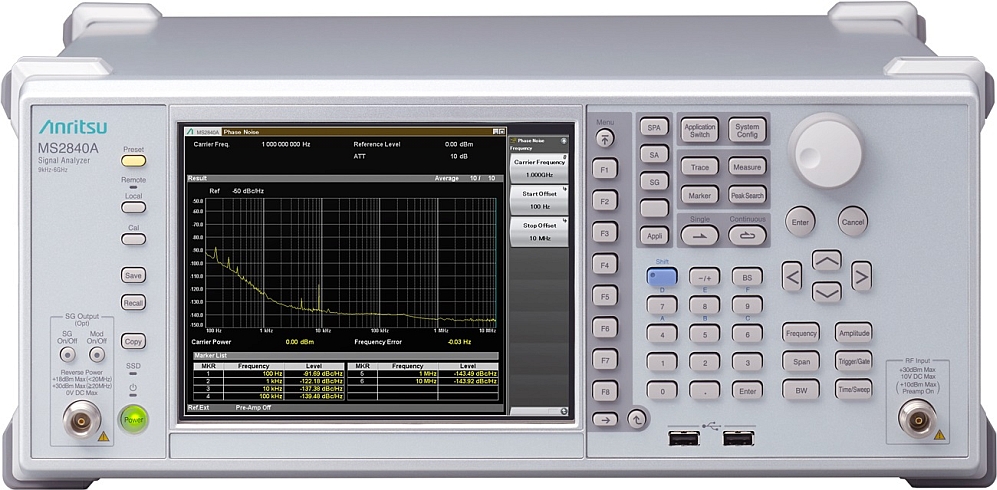 Grâce à une option spécifique, les modèles à 3,6 GHz et à 6 GHz présentent une amélioration de leur bruit de phase en bande latérale unique (SSB). Le bruit de phase atteint par exemple -138dBc/Hz à 1GHz avec un offset de 10kHz jusqu’à 3,7GHz (option MS2840A-066). Sans cette option, il se situe à -123dBc/Hz à 1GHz à 10kHz d’offset de la porteuse.
