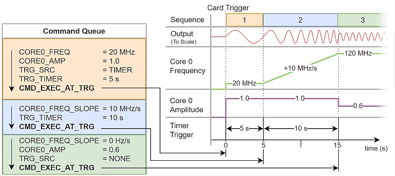 La nouvelle option DDS permet à chacune des voies du générateur arbitraire de générer jusqu’à 64 noyaux sinusoïdaux programmables, également appelés porteuses ou tonalités. Chacun d’entre eux peut être réglé indépendamment en fréquence, amplitude, phase, ainsi qu’en pentes de fréquence et d’amplitude. Toutes les modifications sont réalisées via des commandes qui peuvent être exécutées en temps réel ou dans le cadre de séquences préchargées.