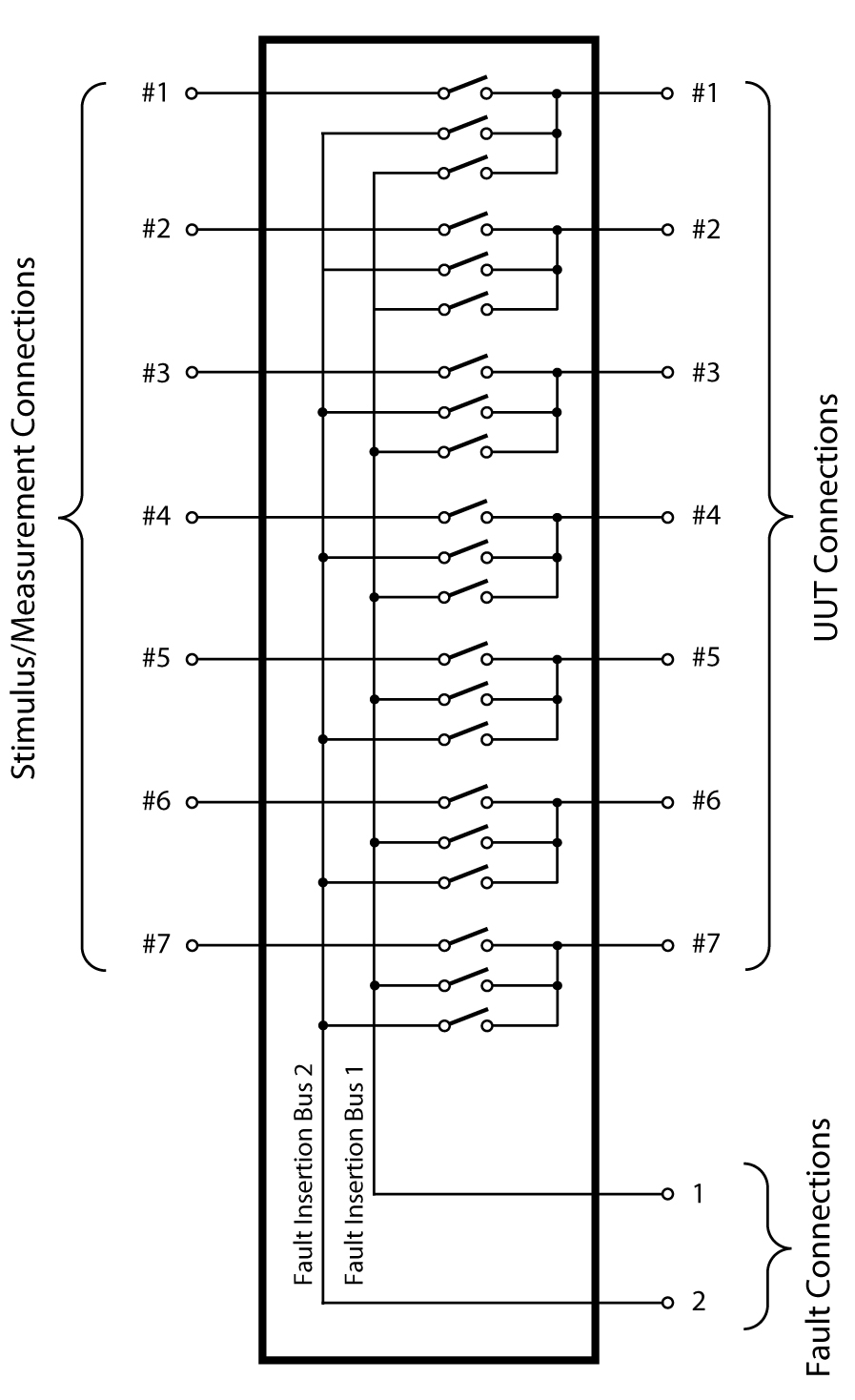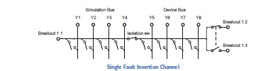 Dans un exemple typique d’insertion de défauts (fig 13), les raccordements de terminaisons en X sont employés pour relier soit un capteur simulé ou une voie réelle de capteur au dispositif sous test. Le relais d’isolation peut être utilisé pour déconnecter la source du capteur et des défauts peuvent être insérés du côté du bus de simulation ou du produit lui-même. Des réseaux de défauts sont reliés sur les raccordements des Y pour simuler des court-circuits à la masse ou à la batterie, ou pour simuler l’effet de courants de fuite sur les pistes. Des résistances élevées de pistes peuvent également être simulées en série avec le signal ou comme fuite entre les pistes des signaux.