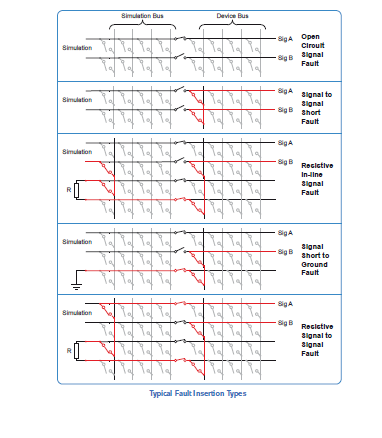 Les méthodes traditionnelles de test comportent souvent le raccordement manuel de câbles à un tableau de connexions, ce qui est loin d’être idéal et peut s’avérer très couteux. Non seulement cette méthode de test est encline à des erreurs humaines mais également très consommatrice en temps. Spécifiquement visant la validation d’ECU, les nouveaux modules de Pickering Interfaces pour l’insertion de défauts permettent une approche, plus automatisée et répétable pour ces scénarii de simulation de défaillances. Généralement, lorsque l’on exécute des applications d’insertion de défauts, trois types de conditions de panne entre l’interface de test et l’équipement sous test sont simulés :
