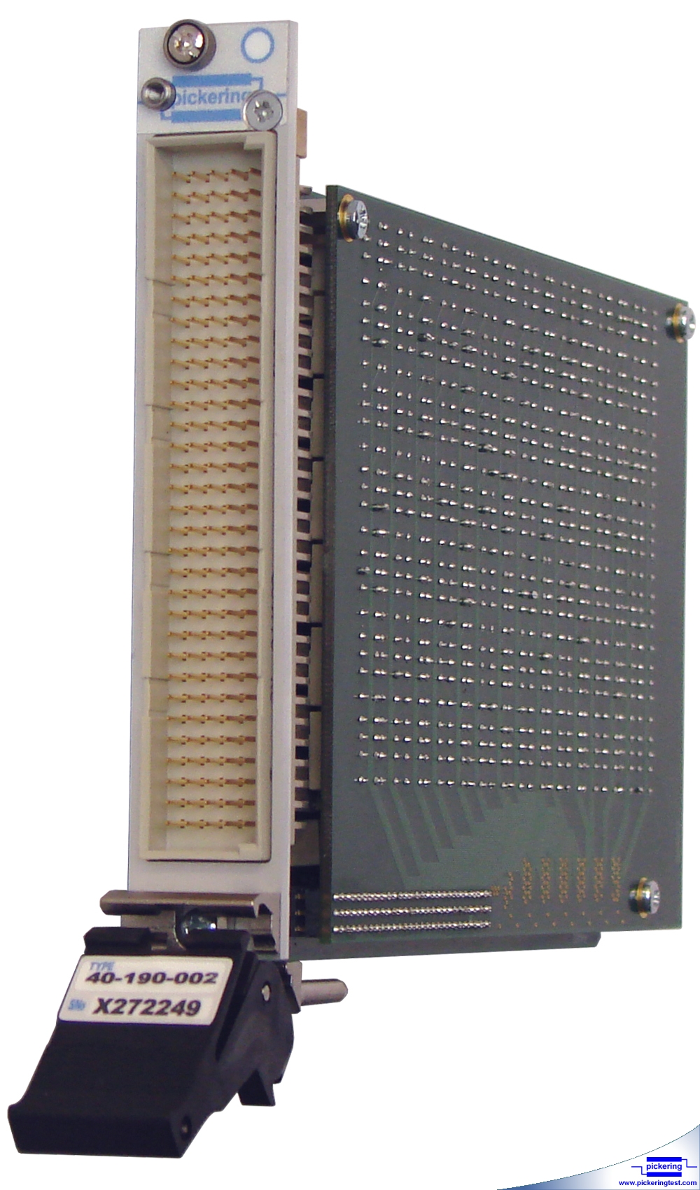 Le 40-190 est un module d’insertion de défauts pourvu de 74 voies avec un ou deux bus de défauts capable de commuter à chaud 2A et 165VDC/115VAC. Ce module fournit une solution d’insertion de défauts très dense, rentable, modulaire et évolutive en 1 slot PXI 3U (figure 7).