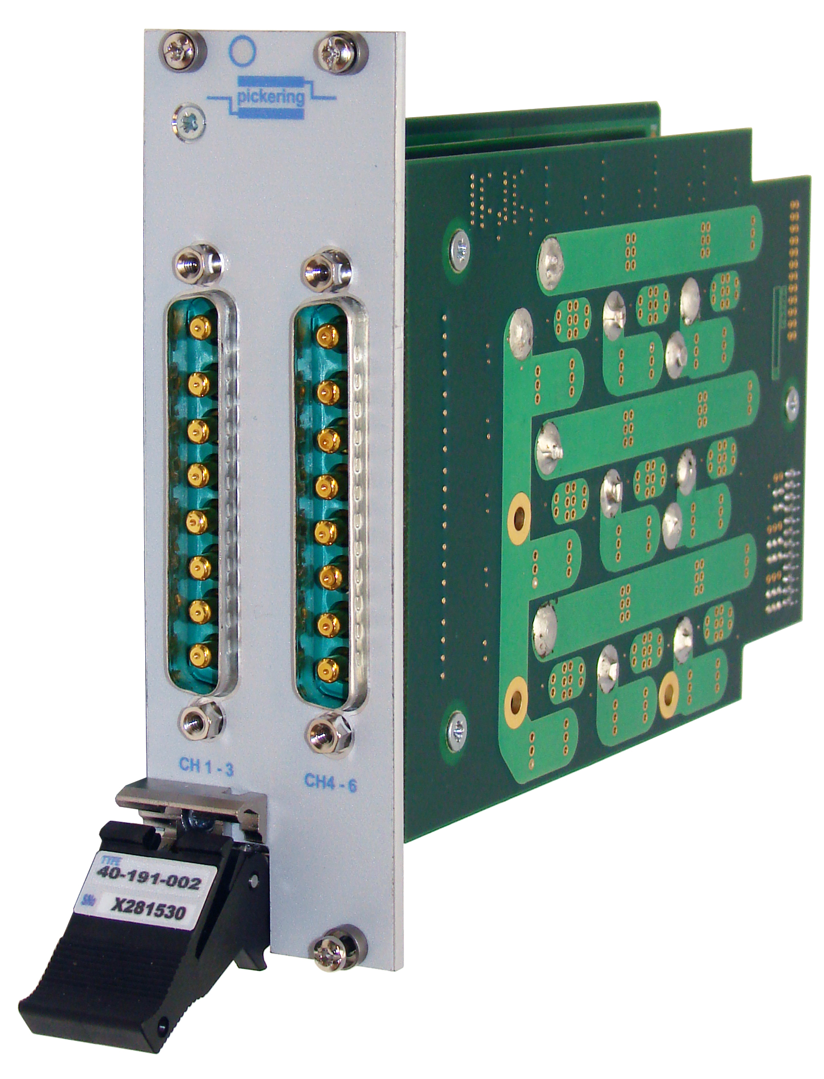 Le 40-191 est un module d’insertion de défauts de 6 voies avec un ou deux bus de défauts capable de commuter à chaud 30A sous 40 VDC. Ce module occupe 2 slots PXI (figure 9).